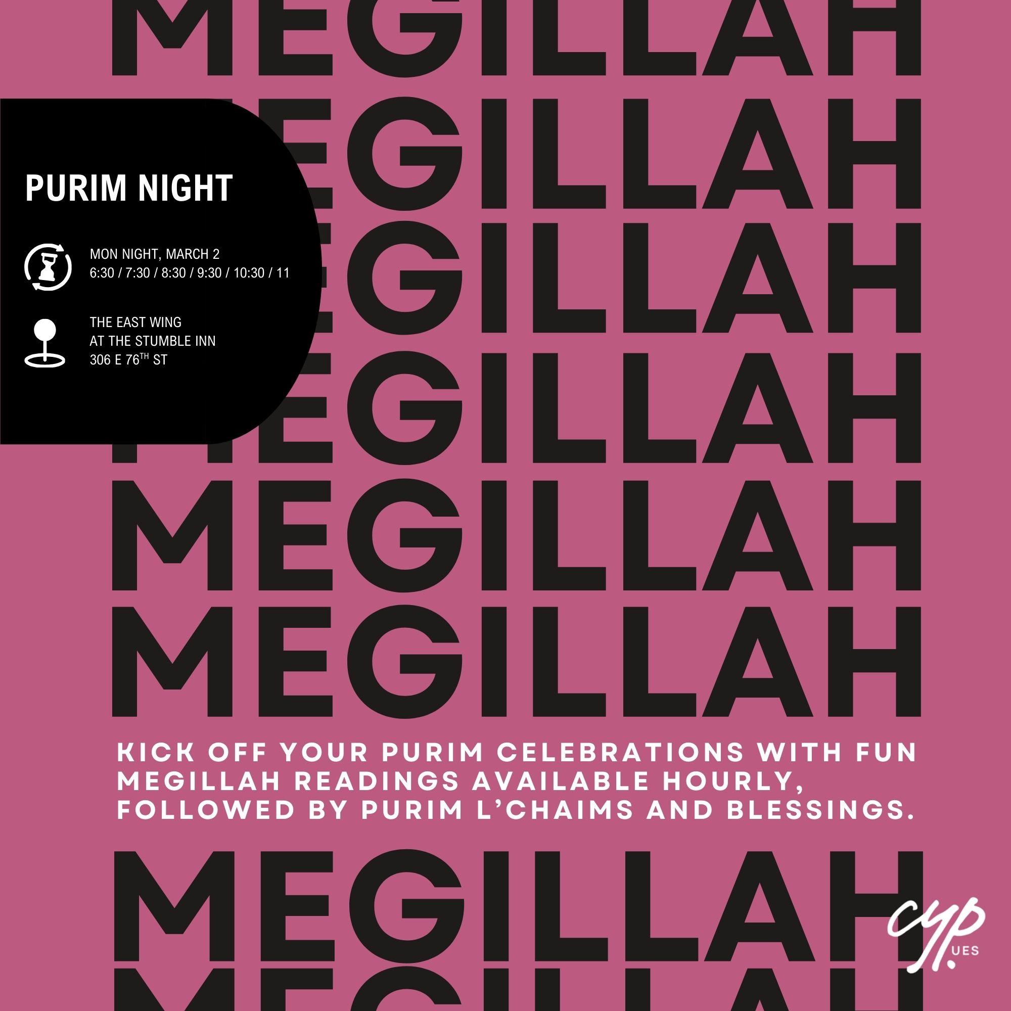 Kick off your Purim celebrations with fun Megillah readings available every hour, followed by Purim L'chaims and Blessings!