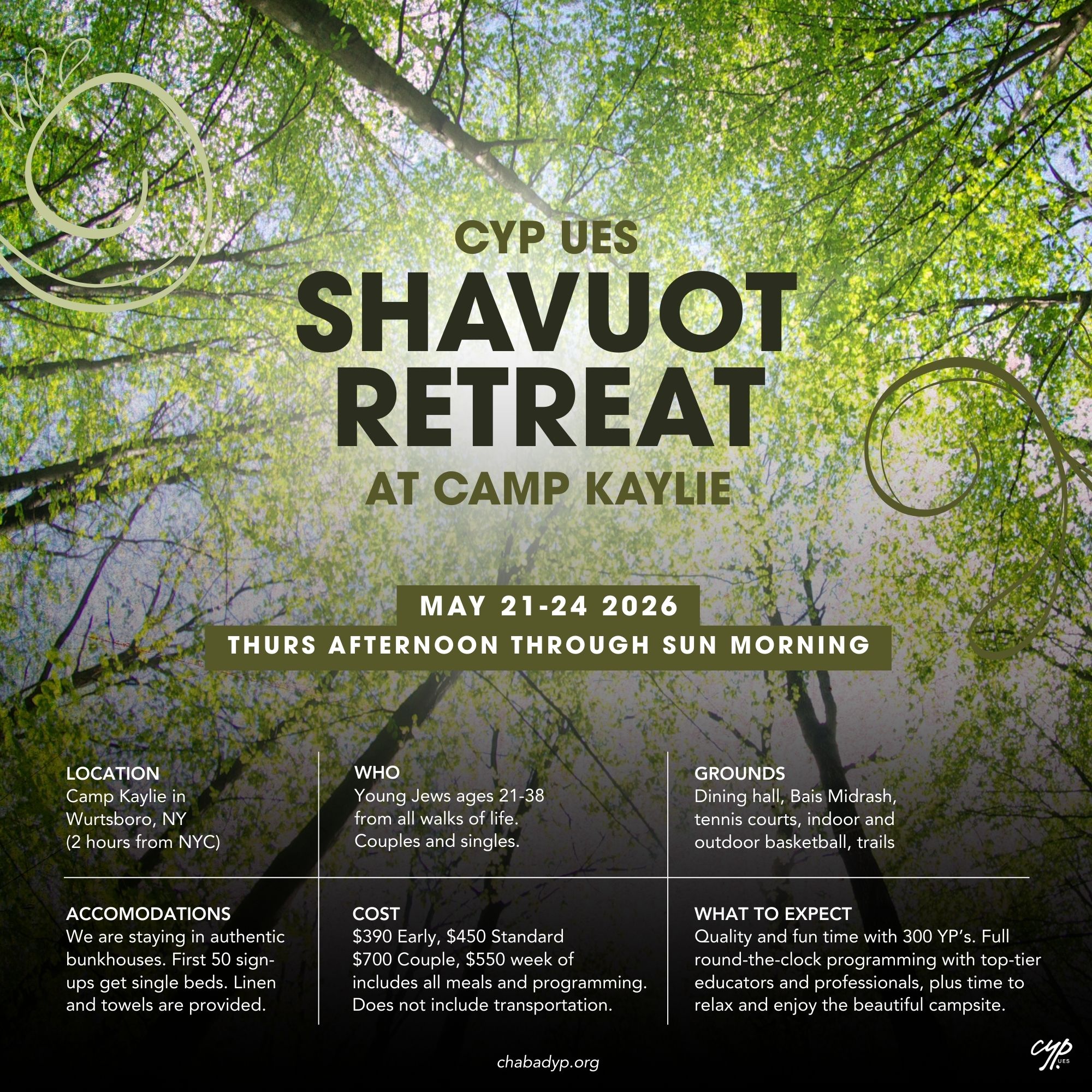 CYP UES Shavuot Retreat at Camp Kaylie May 21-24, 2026 Thursday afternoon through Sunday morning The premier experience for YP’s in an authentic camp setting LOCATION Camp Kaylie in Wurtsboro, NY (2 hours from NYC) WHO Young Jews ages 21-39 from all walks of life. Couples and singles. GROUNDS Dining hall, Bais Midrash, tennis courts, indoor and outdoor basketball, trails ACCOMODATIONS We are staying in authentic bunkhouses. First 50 sign-ups get single beds. Linen and towels are provided. REGISTRATION includes all meals and programming. Does not include transportation. WHAT TO EXPECT